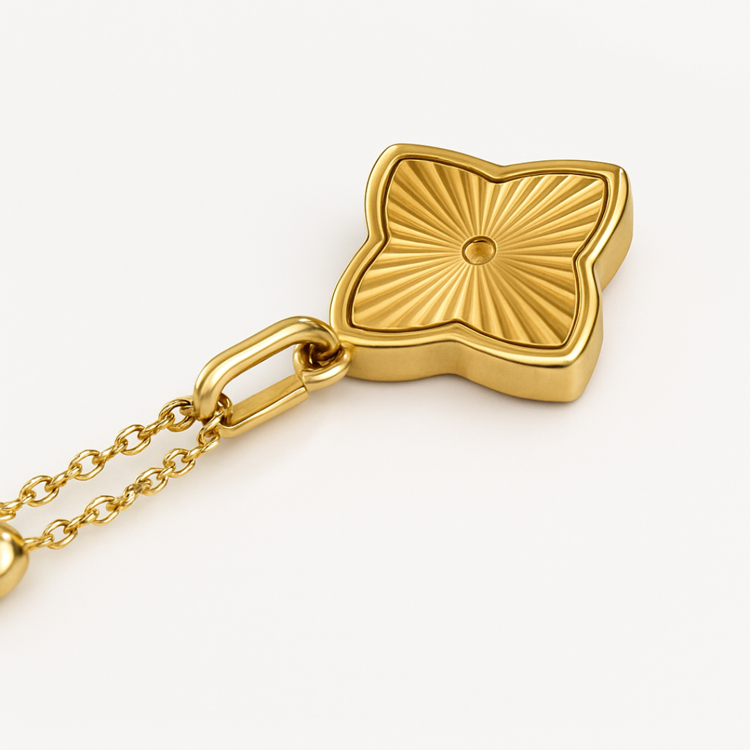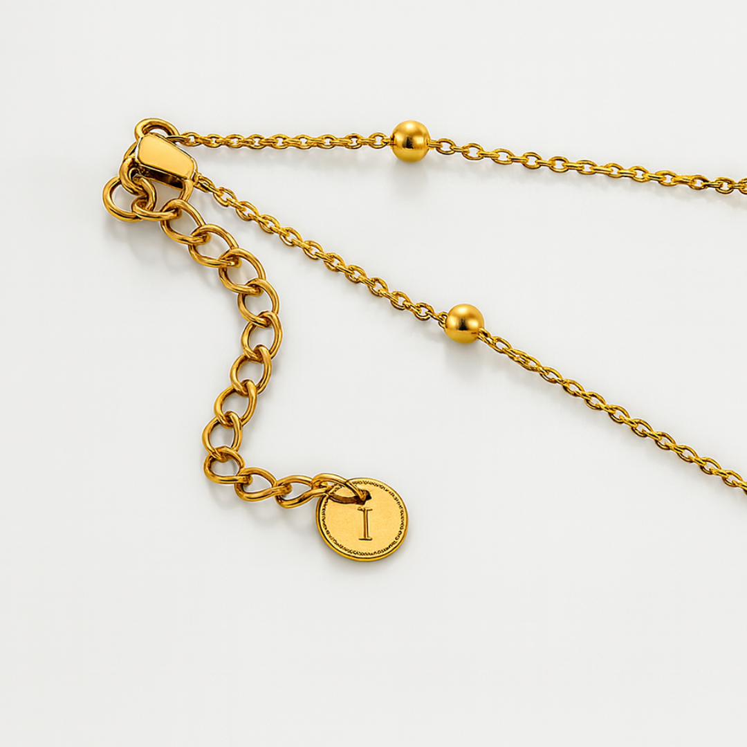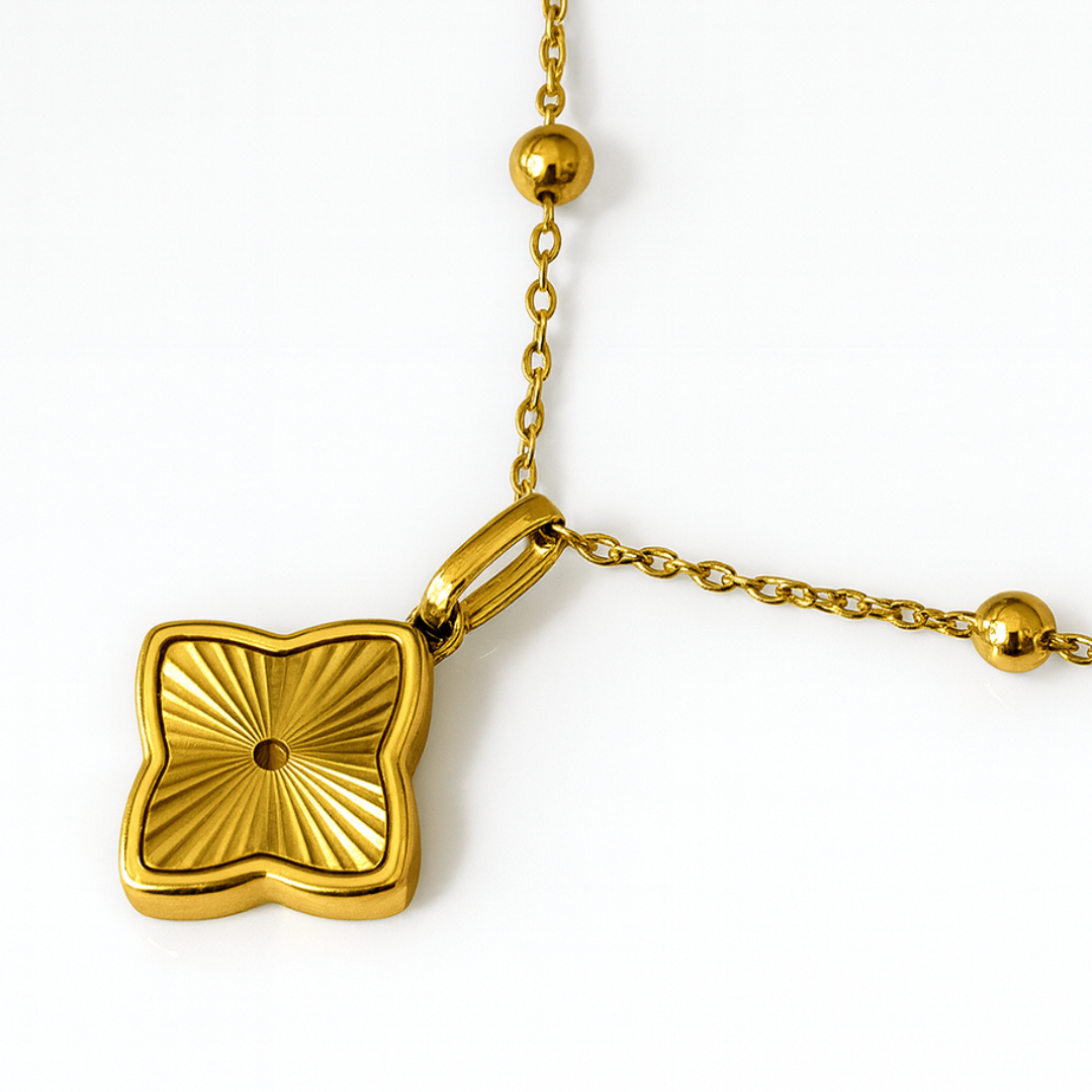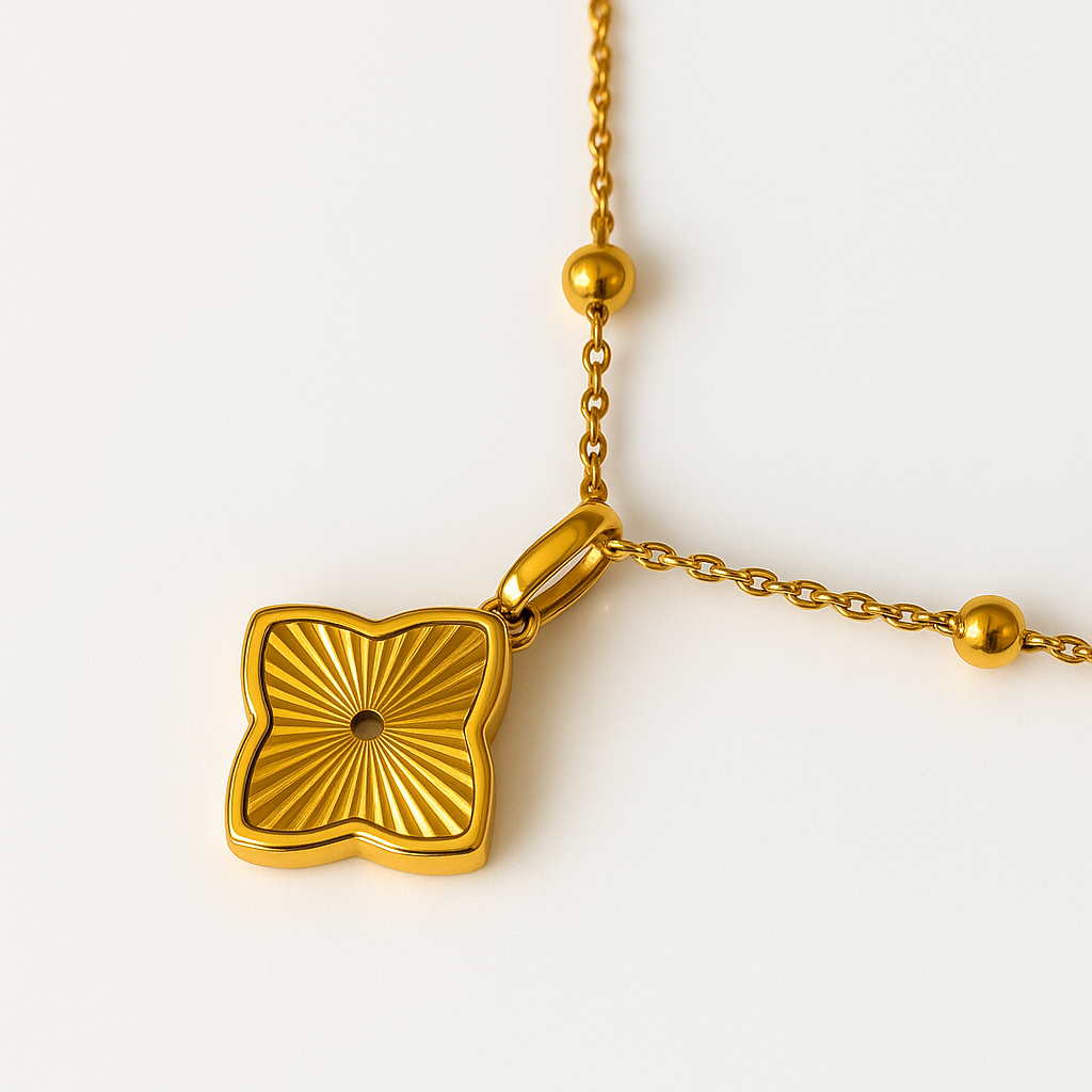 Our necklace is meticulously crafted from premium 18k gold-plated PVD stainless steel, ensuring both an opulent shine and exceptional durability. The advanced PVD (Physical Vapor Deposition) process creates a finish that is far more resilient than traditional plating, making it a true investment in affordable luxury.