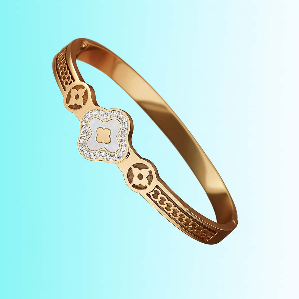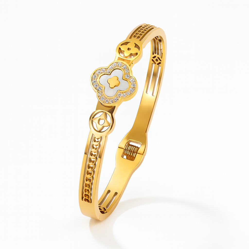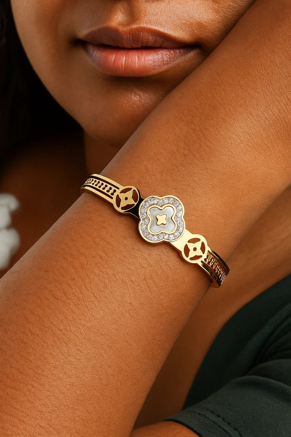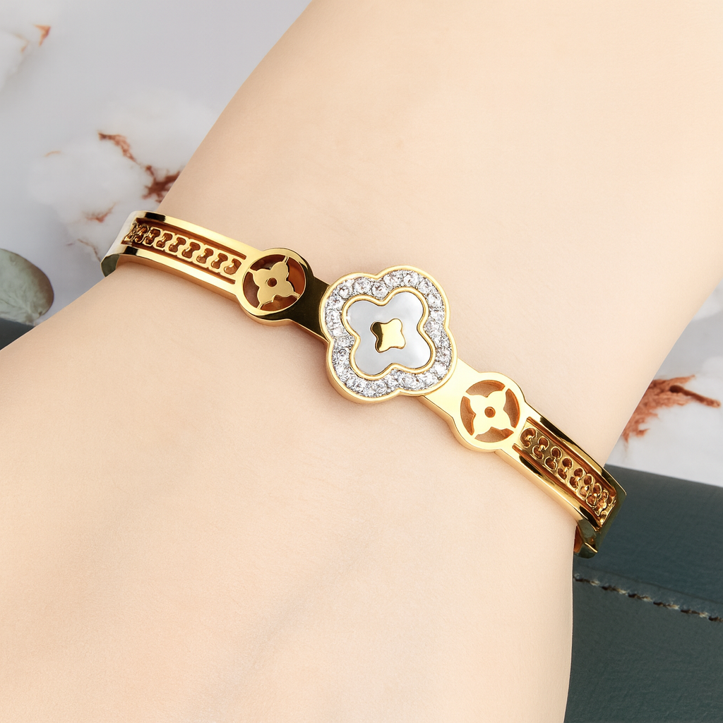 Erin | Gold Plated White Clover charm Zircon Cuff Bracelet Bangle