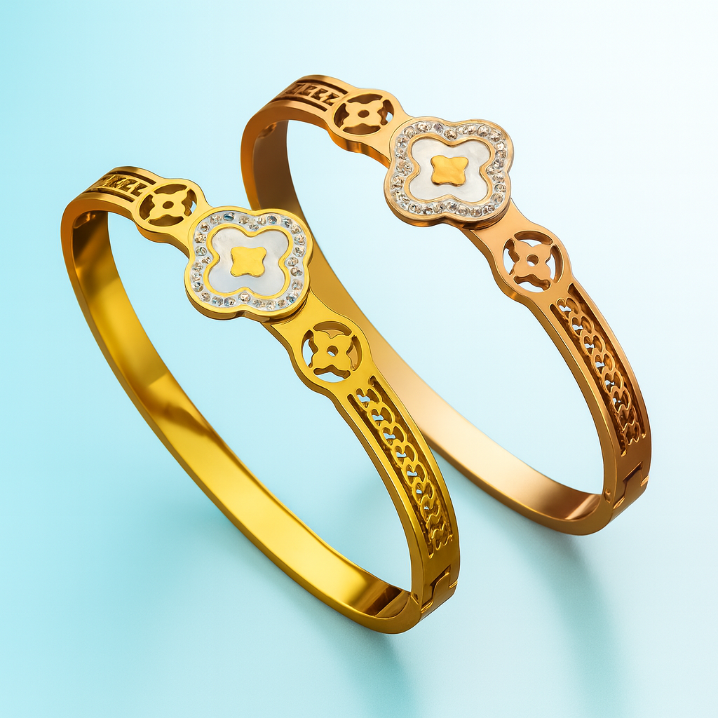 Get ready to steal the spotlight with the Erin Gold Plated White Clover charm Zircon Cuff Bracelet Bangle! Made for today's classy and adventurous ladies, this bracelet blends sophistication with toughness. Worried about allergies or staying dry? Don't be! This bracelet is hypoallergenic and waterproof. You'll be the talk of the town with its stunning embellishments and versatility.