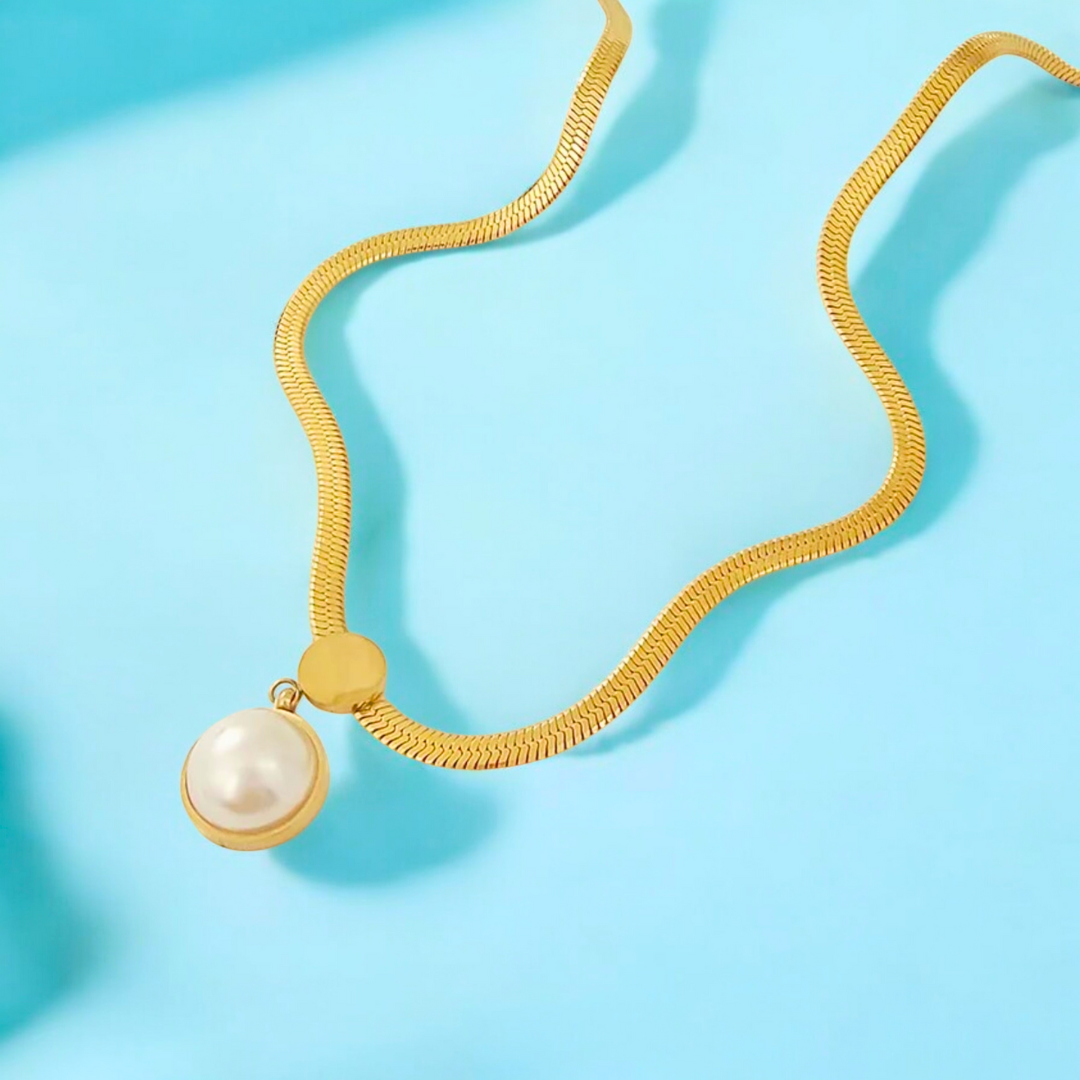 Selyn | Gold (18) Plated Snake Bone Necklace with Round Pearl Waterproof Pendant